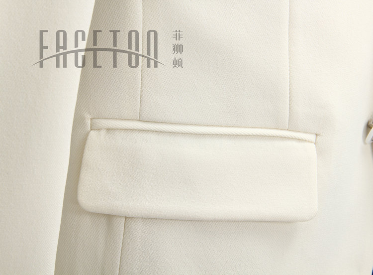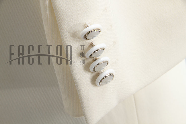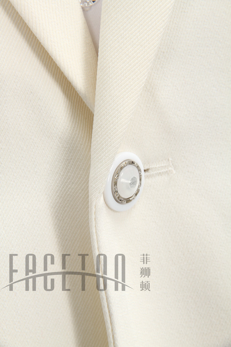 White dinner suit, tailoring in100% wool tweed, features peak lapel, non-vented back, single button, only size 48.