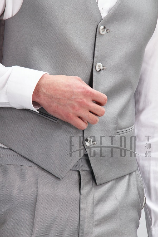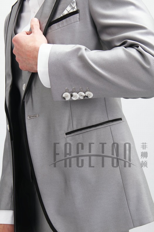 Dark grey, a blend of silk, polyester and wool, single button, features notch lapel trimmed in satin, tweed, double besom pockets, only size 44, 46, 48 available.