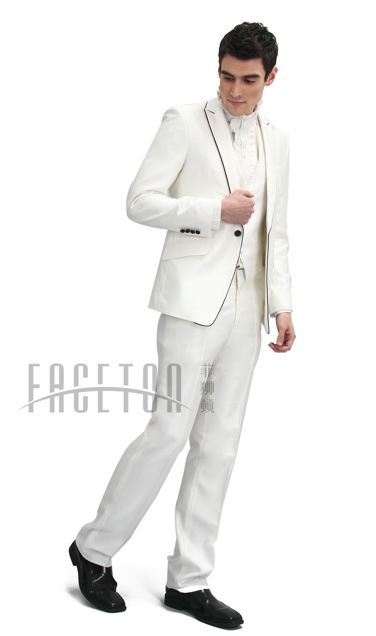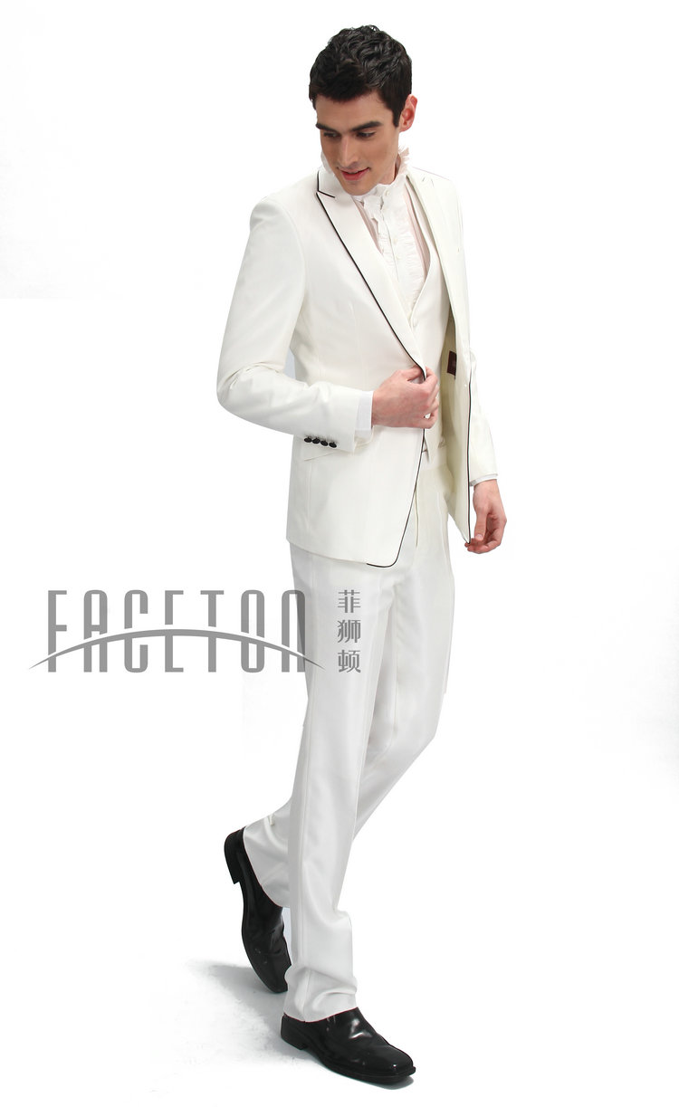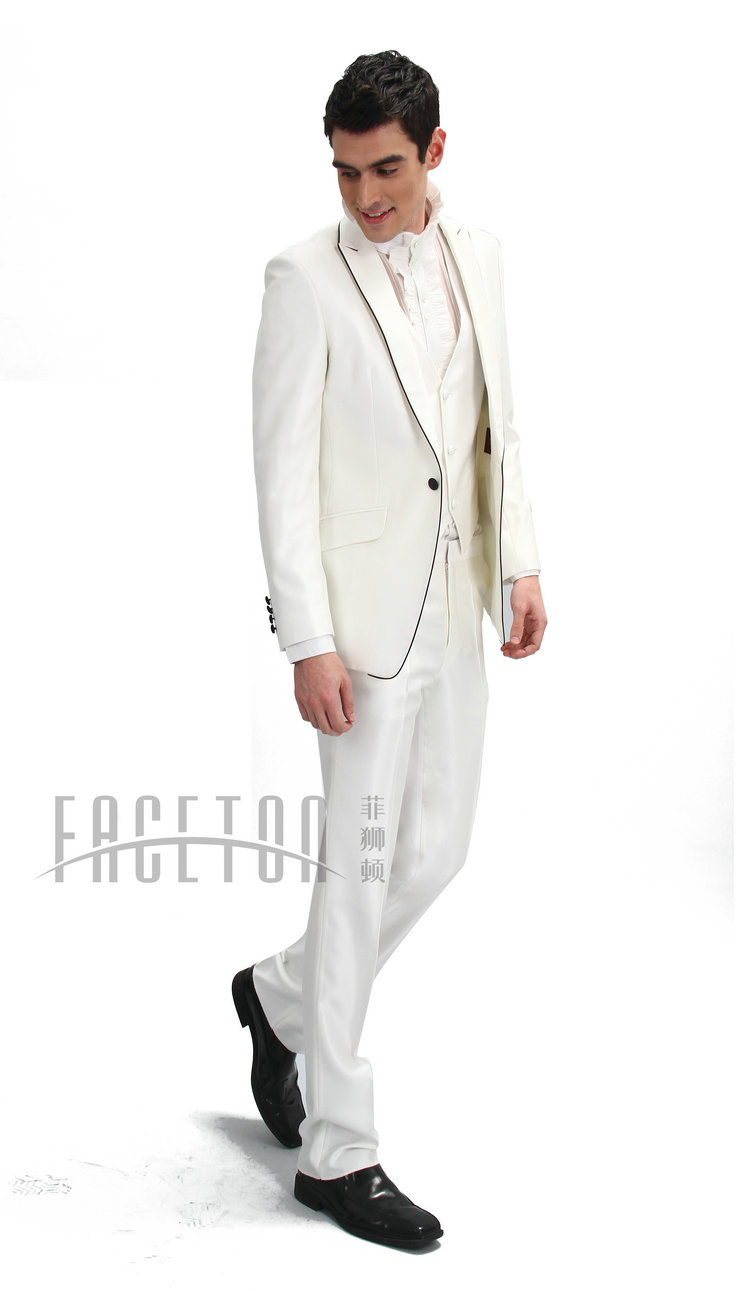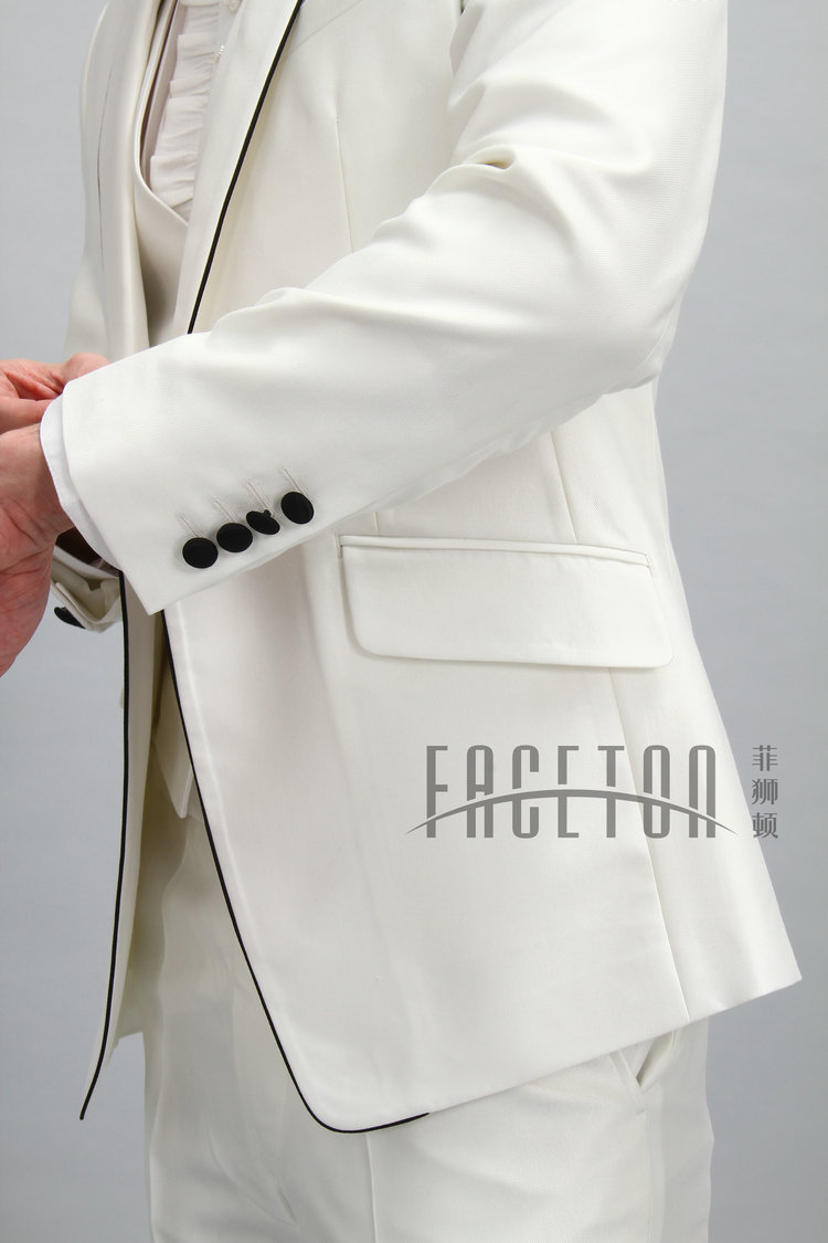 A blend of polyester & cotton, single button, well matched with black silk button. adjustable waist , unhemmed pants.